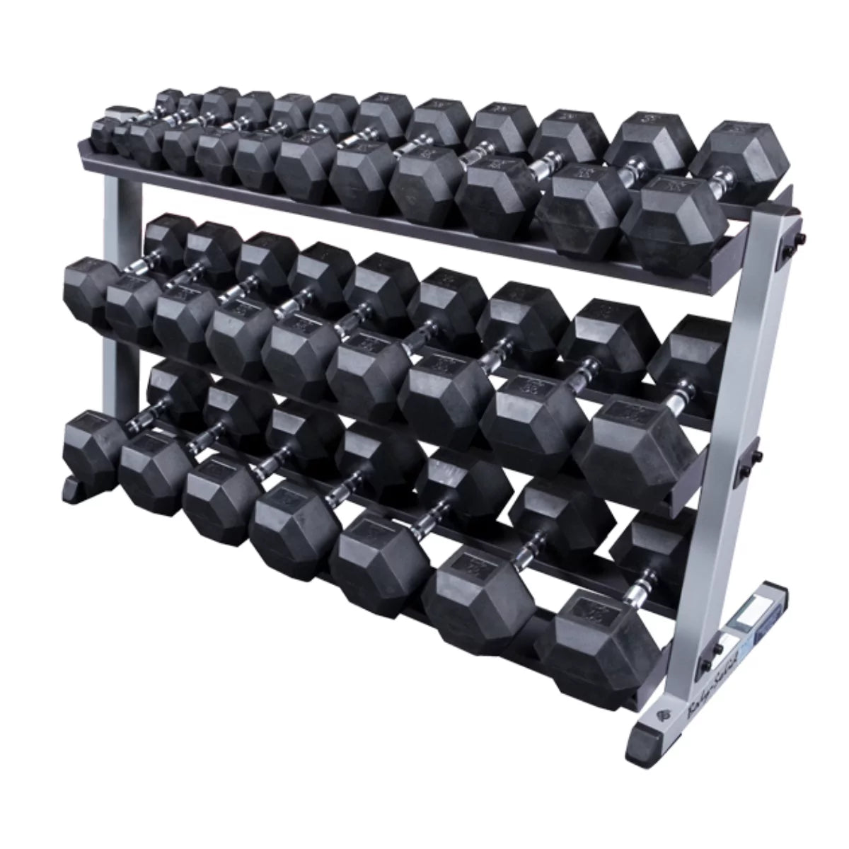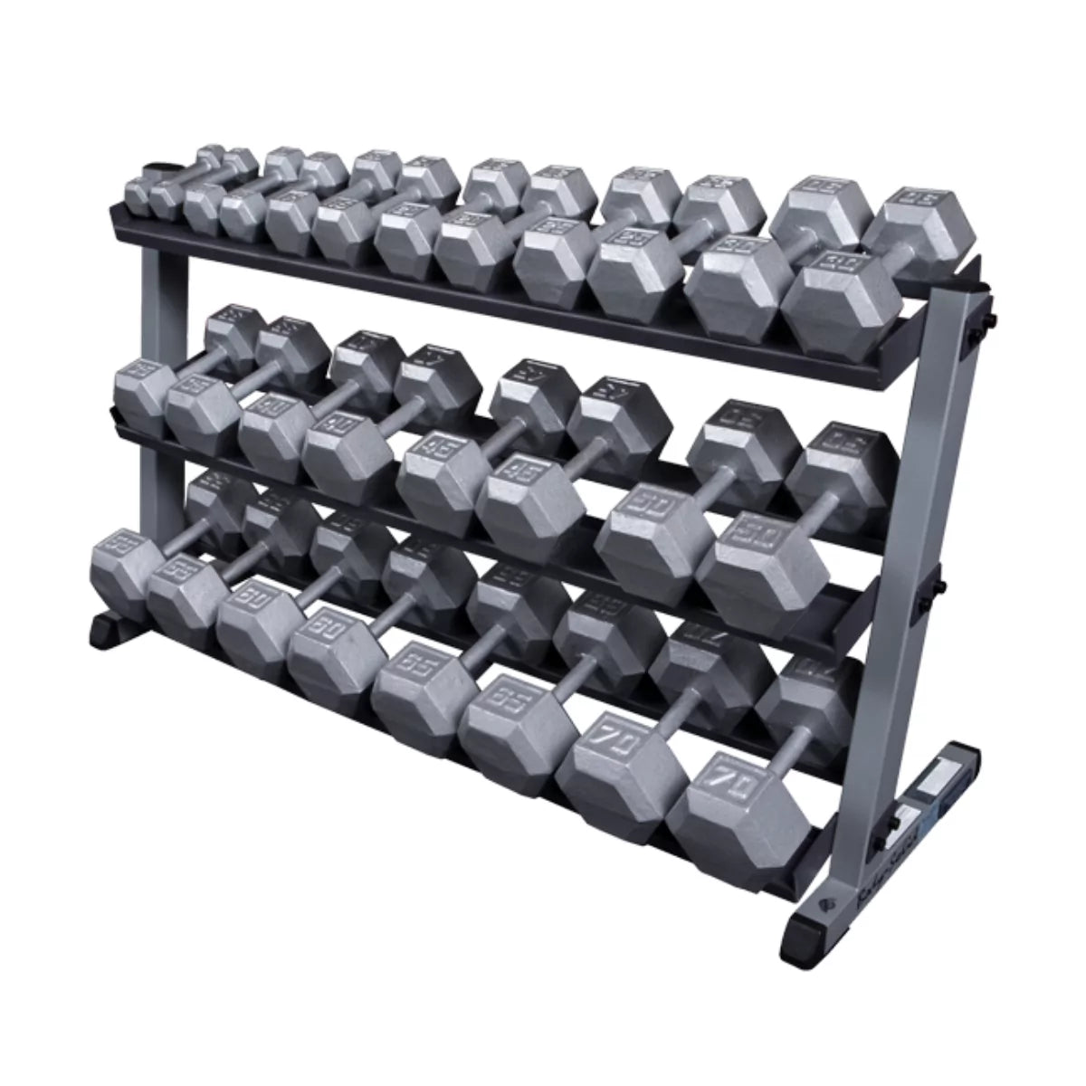 Heavy gauge steel with all-4-side welded construction is deburred inside and out for user safety. The Heavy-duty 2" x 3" mainframe features a reversed pitch design that allows easy access to all three tiers. Holds one (1) pair each of 5-70 lb. hex dumbbells