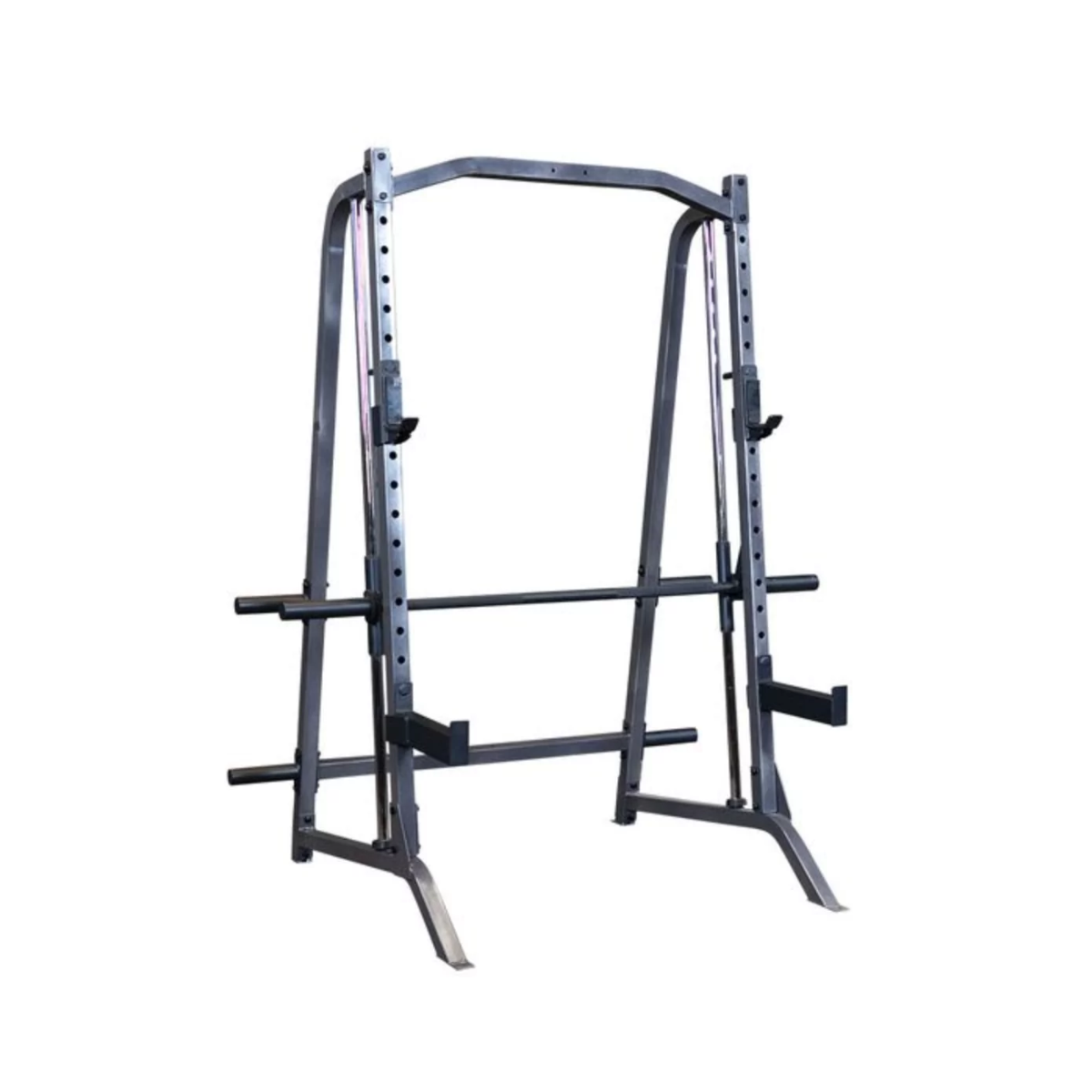For traditional barbell workouts, the Powerline by Body-Solid PSM200 Smith Machine features two composite lined j-cups and two 13" safety spotter arms. Four integrated weight horns on the machine help keep weight plates neat, and organized.